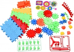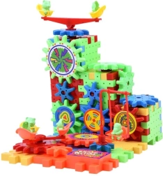 Set obsahuje ozubené kolečko napájené baterií AA, které děti mohou použít k oživení staveb.