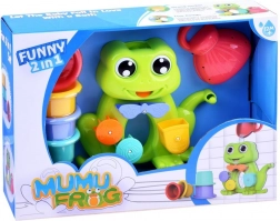 Roztomilá žabka do vany přináší dětem při koupání spoustu zábavy. Nalévejte vodu do žabí hlavičky a sledujte kaskádu rotujících bubnů, která vytváří veselé vodní efekty. Součástí jsou 4 barevné stohovací kelímky pro nalévání, třídění a stavění, které rozvíjejí jemnou motoriku, koordinaci a kreativitu.