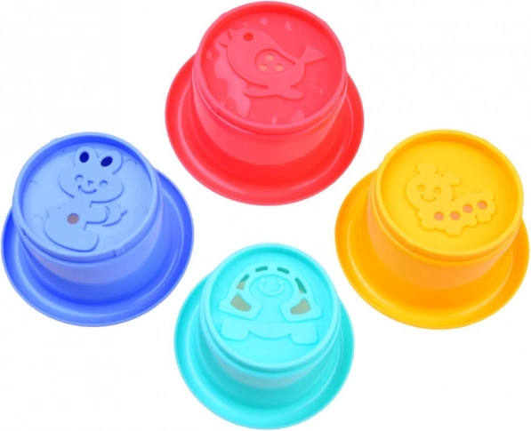 Čtyři kelímky různých velikostí podporují třídění, stohování a rozvoj jemné motoriky i poznávání barev.