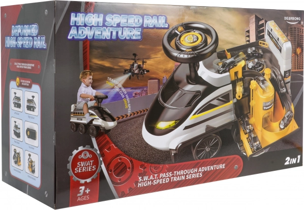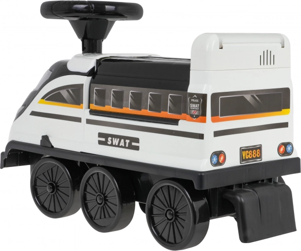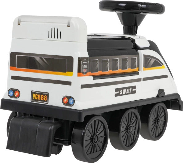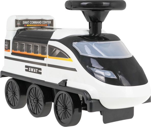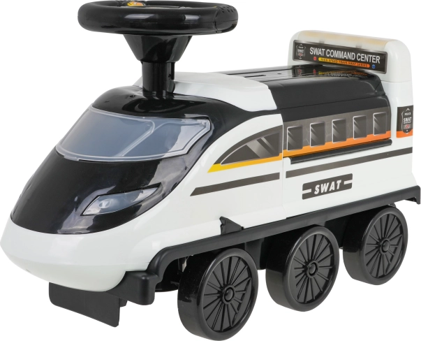 Interaktivní odrážedlo ve tvaru lokomotivy přináší nezaměnitelné herní zážitky. Vyrobené z vysoce kvalitního, odolného a netoxického plastu. Tento odrážedlo zvládne jízdu po šesti kolech, z nichž dvě přední jsou otočná. Pod sedadlem se skrývá rozložitelný policejní park s rampami, pohyblivým výtahem, otevírací závorou, zvedákem a otočným kolečkem.