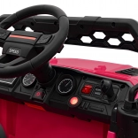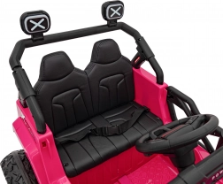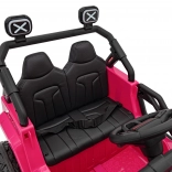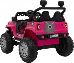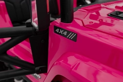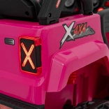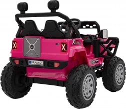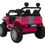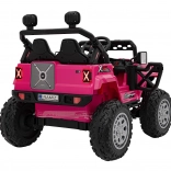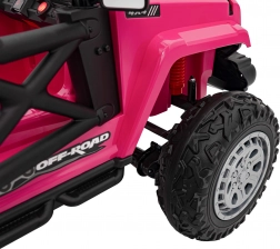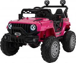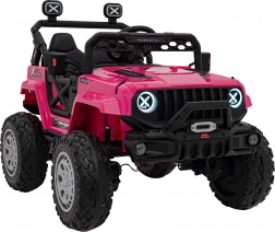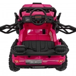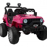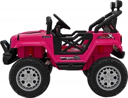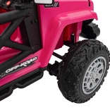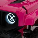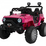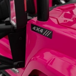 Toto růžové auto imituje skutečné off-road vozidlo s robustní konstrukcí a velkými, odolnými koly pro všechny terény.