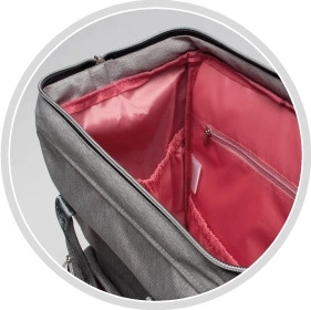 - Termo kapsa na láhev/hrníček, voděodolná kapsa, boční kapsa na ubrousky, boční kapsa na láhev, skrytá kapsa na dokumenty, vnitřní organizér