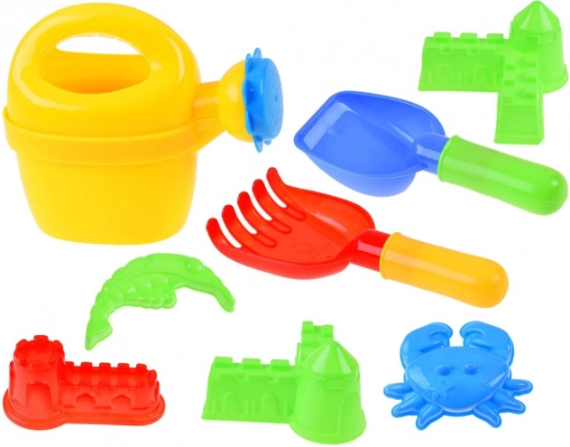 V sadě najdete konev, hrabky, lopatku a různé formičky. Tato pestrá kolekce nabízí široké možnosti pro tvorbu a konstrukci na pískovišti.