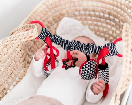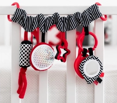 Kontrastní barvy černá, bílá a červená přitahují dětskou pozornost a podporují soustředění i sledování objektů očima. Integrované zrcátko a šustivé/zvonivé elementy rozvíjejí smyslové vnímání, zatímco pestré stuhy a různé textury motivují k uchopování a procvičují jemnou motoriku.