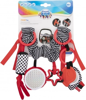 Podporujte vývoj miminka od prvních týdnů s kontrastní závěsnou hračkou CANPOL BABIES z kolekce SENSORY. Díky černobílým kontrastům, zrcátku, šustivým prvkům a různým texturám stimuluje zrak, sluch i hmat. Dvě možnosti uchycení umožní snadné připevnění na kočárek, autosedačku nebo postýlku. Měkká kousátka uleví citlivým dásním při růstu zoubků.