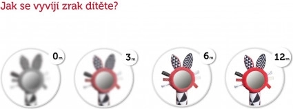 - Senzorická stimulace – kontrasty, zvuky, textury, zrcátko