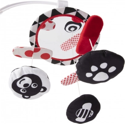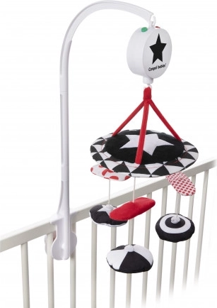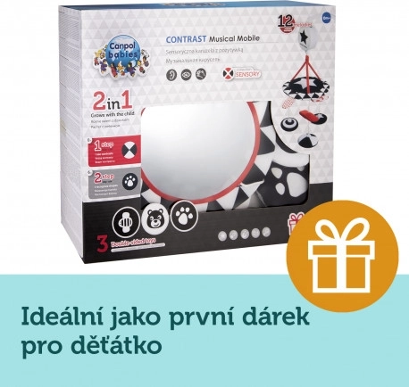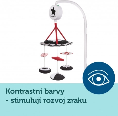 Kolotoč z kolekce SENSORY byl vyvinut pro nejmenší děti s důrazem na rozvoj smyslů a klidné usínání. Kontrastní barevnost černá–bílá–červená přirozeně poutá dětskou pozornost, zatímco jemné melodie pomáhají k relaxaci. Velké zrcátko podporuje sebereflexi a zaměřování pohledu, odnímatelné plyšové prvky s všitými magnety usnadňují manipulaci a udržování hygieny.