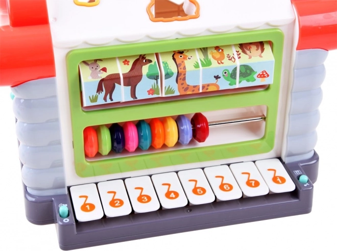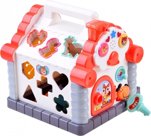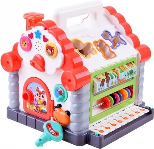 Tento objevný domeček je vyroben z kvalitního, odolného plastu v atraktivních barvách. Nabízí bohaté interaktivní funkce: po vložení správného dílku se ozve zvuk příslušného zvířátka, miniklaviatura přehraje stupnici i 7 oblíbených melodií a počítadlo podporuje první počítání. Díky klíčku a dvířkům děti trénují jemnou motoriku a koordinaci oko–ruka.