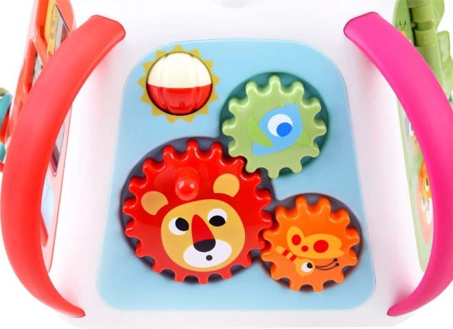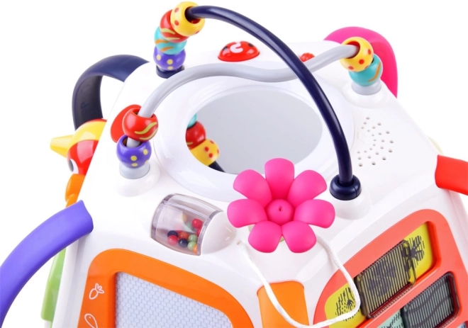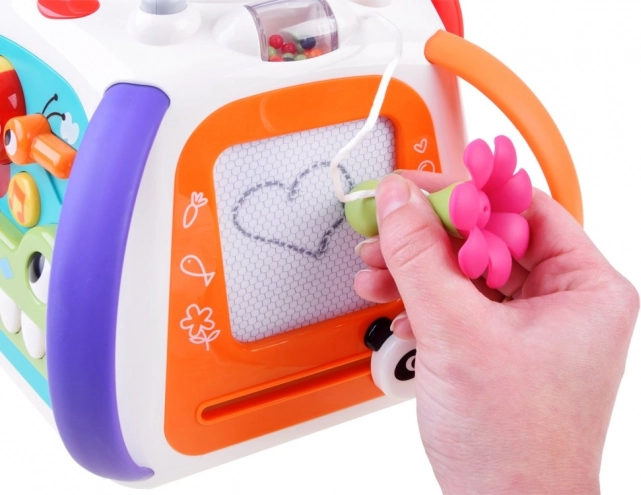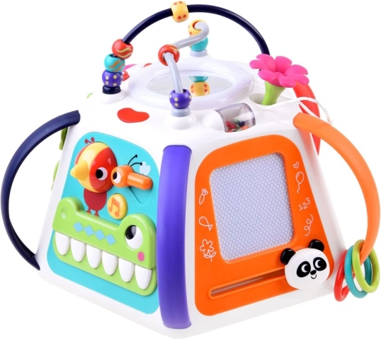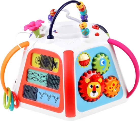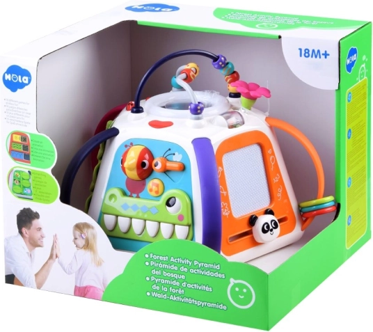 Vzdělávací multikostka HOLA přináší bohaté spektrum aktivit v jedné kompaktní hračce. Každá strana nabízí jinou dovednost: od kreslení na znikopis, přes otáčení ozubených koleček, po objevování zvířátek pod lístky se zvukovou odezvou. Horní část zdobí korálkový labyrint, který podporuje koordinaci ruka-oko.