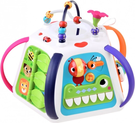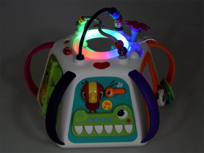 Po zapnutí spustí kostka melodie, zvukové efekty a světelné prvky, které děti motivují k dalšímu zkoumání. Nechybí pianinko v podobě krokodýlích zoubků, pohyblivé prvky, posuvné panely s optickým efektem “živé” animace ani bezpečné zrcátko.