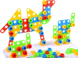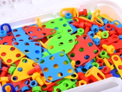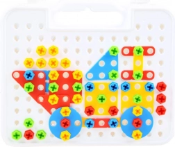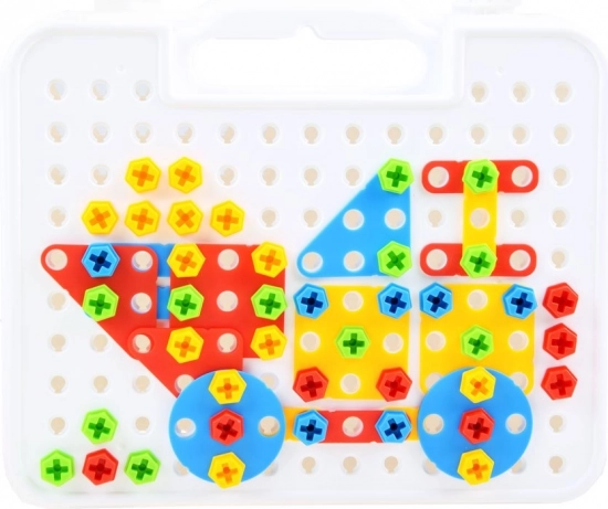 Tato kreativní stavebnice pro malé kutily nabízí neomezené možnosti stavění. Děti si mohou vytvářet 2D obrázky i 3D modely pomocí perforované desky, šroubků a pestrých dílků v různých tvarech. Kufřík s rukojetí zajistí snadné přenášení i přehledné ukládání všech komponentů.