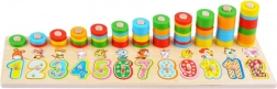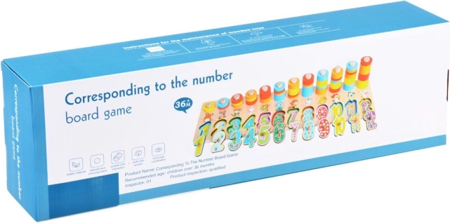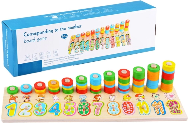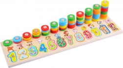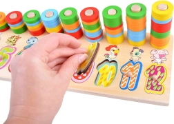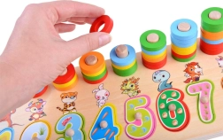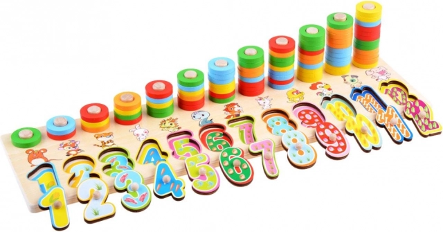 Tato vzdělávací dřevěná hračka kombinuje skládání tvarů, třídění barev a první matematiku. Děti vkládají velké číslice do správných otvorů a navlékají barevné kroužky na kolíky, čímž snadno pochopí hodnotu čísel a základní počítání. Ilustrace zvířátek u jednotlivých čísel podporují paměť a rozvoj slovní zásoby.