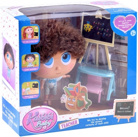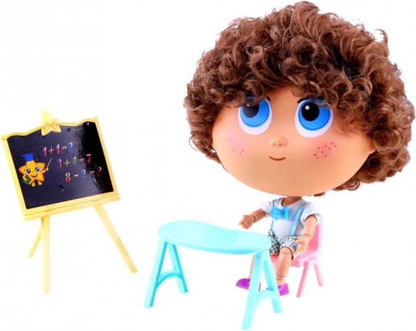 Roztomilá panenka učitel Tymek pro hru na školu přináší dětem spoustu fantazie i zábavy. V balení najdete tabuli, stůl a židličku. Panenka má pohyblivé klouby a hlavu otočnou o 360°, velké modré oči, pihy a kudrnaté vlasy. Skvělé pro rolové hry a rozvoj kreativity.