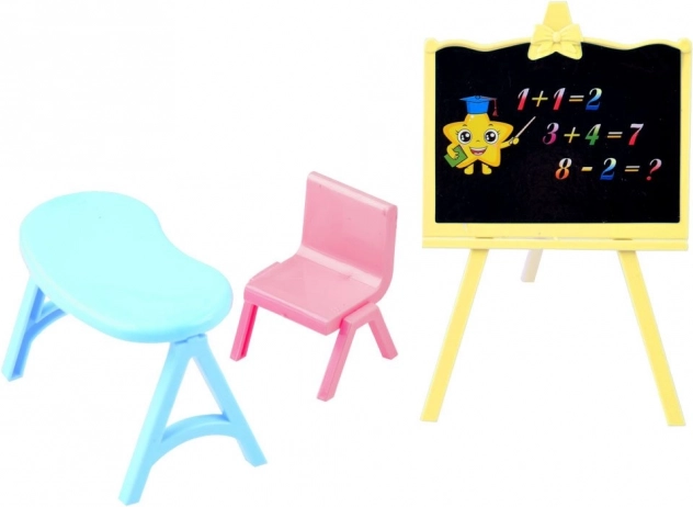 Kompletní výbava pro hru na školu. Děti mohou psát na tabuli, posadit panenku k lavici a vytvářet vlastní vyučování.