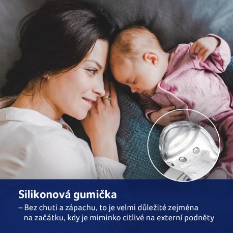 Dovoluje volné dýchání nosem a zabraňuje otlačení. Vyrobeno z bezpečných materiálů bez BPA.