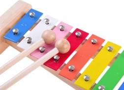 Xylofon s duhovými kovovými klávesami umožňuje dětem prozkoumat melodie a rozvíjet hudební sluch. Je ideální pro učení základních hudebních principů.