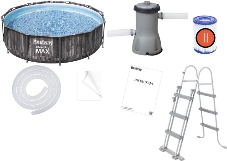 - Kompletní set 8v1 – bazén, pumpa 2006 l/h, hadice, spony a sítka, filtr typ II, žebřík, návod.