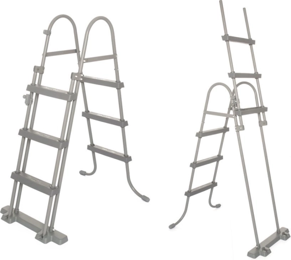 Robustní žebřík usnadňuje vstup i výstup z bazénu. Výklopné stupně pomáhají omezit přístup dětí bez dohledu dospělých.