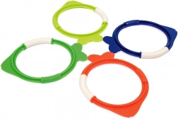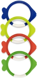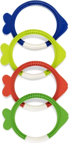 Sada potápěcích kroužků ve tvaru rybek je zábavná i edukativní pomůcka pro bazén. Po vhození se rybky pomalu potápějí, takže děti mohou trénovat orientaci pod vodou, zadržení dechu a bezpečné potápění. Jasné barvy usnadňují hledání a zvyšují motivaci ke hře.