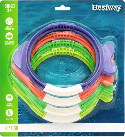 Objevte svět vodních dobrodružství se sadou čtyř barevných rybek BESTWAY pro děti od 3 let. Tyto potápěcí kroužky ve tvaru rybek v barvách žlutá, modrá, červená a zelená se po vhození do vody potápějí na dno a motivují děti k potápění a lovení. Podporují koordinační schopnosti, zlepšení plaveckých dovedností a přirozenou radost z pohybu ve vodě. Kompaktní balení usnadňuje přenášení i skladování.