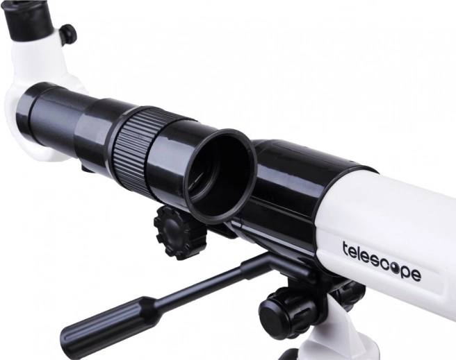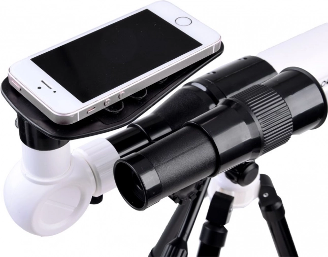 Dětský teleskop na stativu s okuláry 20x/30x/40x, šikmým zrcátkem a držákem telefonu. Lehký, snadno ovladatelný, ideální pro pozorování Měsíce i Země.