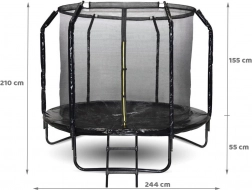 Zábava, pohyb a bezpečí v jednom – zahradní trampolína SKYFLYER 244 cm nabízí pevný ocelový rám, ochrannou síť s profilovanými sloupky a odolnou skákací plochu z PP JUMPING MAT. Součástí je žebřík, kotvy s popruhy i plachta proti dešti pro bezstarostné používání na zahradě.