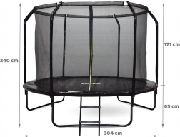 Model SKYFLYER 10 ft (304 cm) je komplexní zahradní trampolínový set pro celou rodinu. Ochranná vnitřní síť se zipem a přezkou, U-nohy pro stabilitu a 8násobně prošívaná skákací plocha z pevného polypropylenu přinášejí vysokou životnost i bezpečné skákání. Montáž je jednoduchá a díky kotvám a popruhům drží trampolína pevně i při silnějším větru.