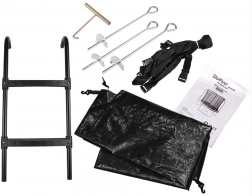 Součástí balení je dvoustupňový žebřík pro snadný vstup, kotvy s popruhy pro zajištění a voděodolný kryt pro ochranu proti počasí.