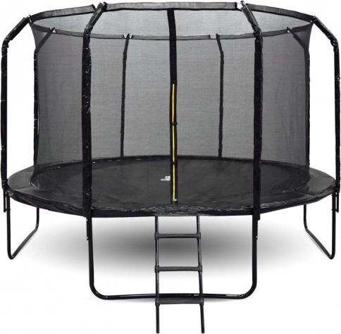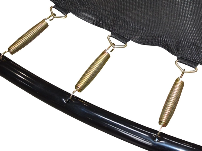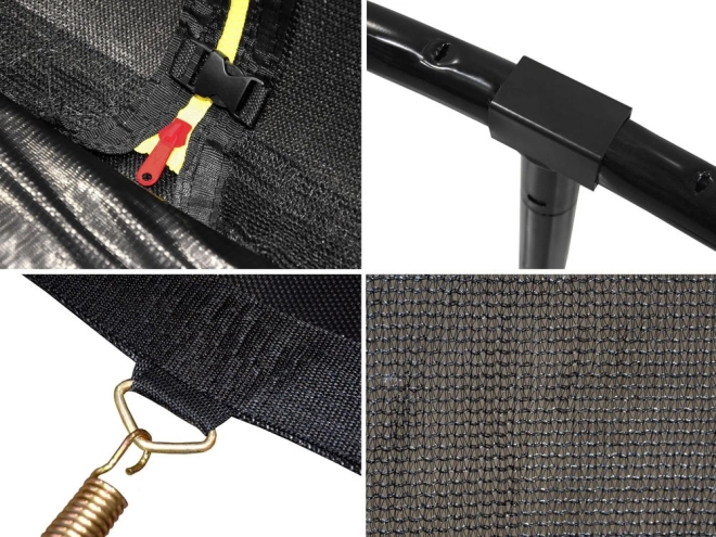 Vysoká ochranná síť napnutá kroužkem drží tvar, vstup je zajištěn zipem a přezkou. Profilované kovové sloupky mají měkké polstrování pro bezpečné skákání.