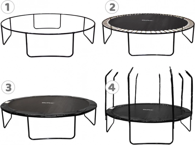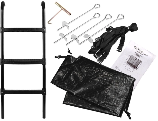 - Žebřík, ochranná síť, šňůra pro fixaci sítě, kotvy s popruhy, voděodolný kryt, ochranný límec pružin, klíč na pružiny, montážní návod
