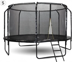Skákací plocha z kvalitního polypropylenu je vícenásobně prošívaná (až 8 švů) a doplněná o oxidované pružiny kryté ochranným límcem. Stabilitu zajišťují U‑nohy se šrouby montovanými zevnitř konstrukce, takže vnější strana je hladká a bezpečná. V balení najdete i žebřík, kotvy s upínacími popruhy a voděodolný kryt pro jednoduché používání a údržbu.