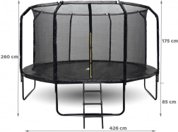 Robustní trampolína SkyFlyer o průměru 426 cm (14 ft) nabízí velkorysý prostor pro skákání, kondiční cvičení i volnočasovou zábavu. O bezpečí se stará vysoká ochranná síť vypnutá pomocí horní obruče a měkce polstrované profilované sloupky. Vstup je jištěn zipem a přezkou pro maximální bezpečnost dětí.