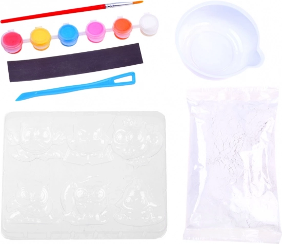 - Forma s motivy sov, sádrový prášek, míchací kelímek, špachtle/paletový nožík, štětec, 6 barev, magnetická páska