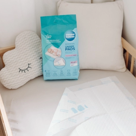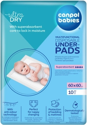 Praktické jednorázové podložky Canpol babies o rozměru 60 × 60 cm spolehlivě chrání postel, kočárek i přebalovací pult. Díky superabsorpčnímu jádru rychle sají tekutinu, uzamykají vlhkost uvnitř a neutralizují nepříjemné pachy. Měkký povrch je šetrný k pokožce, spodní strana je voděodolná. Ideální pro přebalování miminek, pro ženy v poporodním období i pro inkontinenci. Dermatologicky testováno.