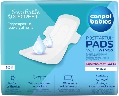 Ultratenké poporodní vložky s křidélky CANPOL babies pro pohodlné použití doma po porodu. Nabízejí vysokou savost, prodyšnost a spolehlivou ochranu proti protečení. Díky profilovanému tvaru, 4 křidélkům a širokému lepicímu proužku drží bezpečně na místě i při pohybu. Technologie neutralizace zápachu zajišťuje dlouhotrvající pocit svěžesti.