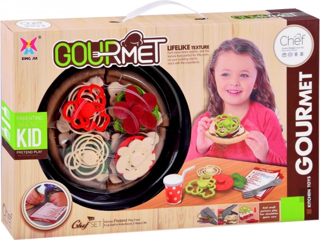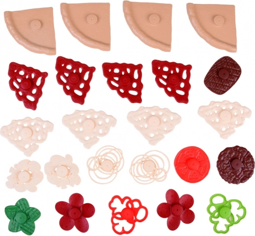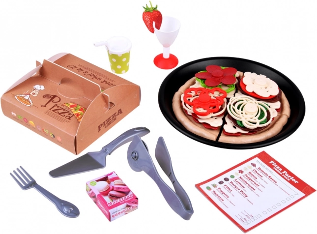 Součástí jsou díly těsta, omáčka, plátky sýra a mnoho barevných toppingů jako pepperoni, houby, paprika, rajče či salát. Nechybí kolečko na krájení, lopatka na pizzu, příbory, talíř, nápojové kelímky, menu ani krabička na pizzu.