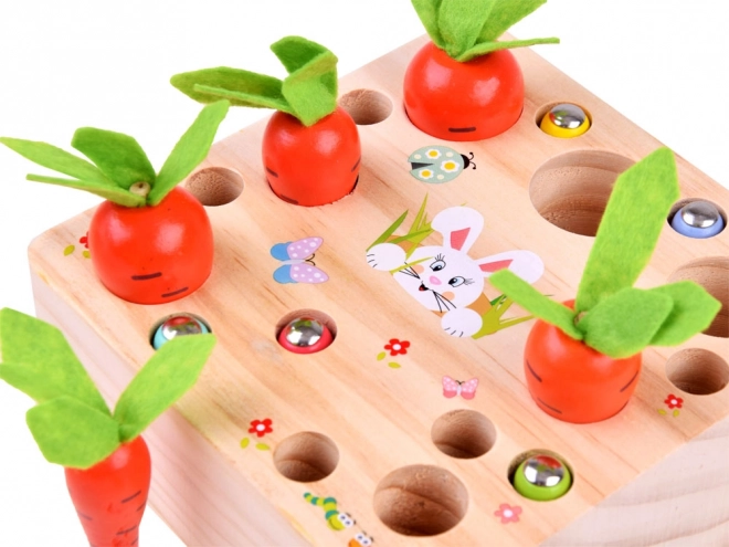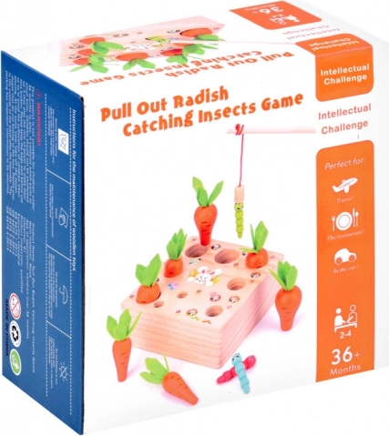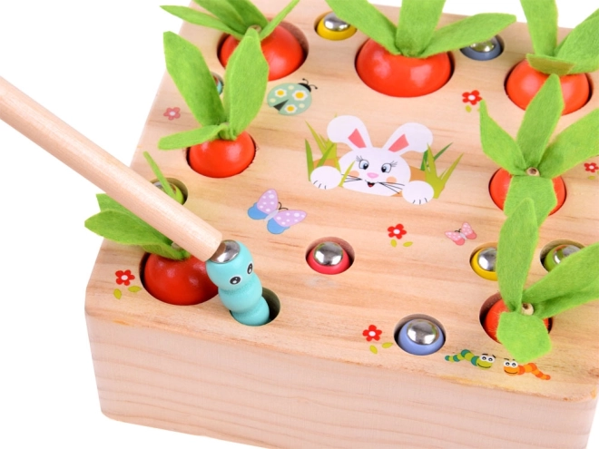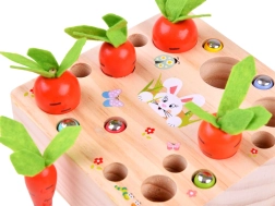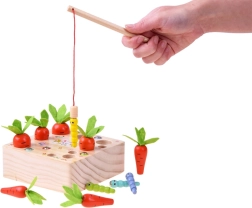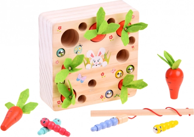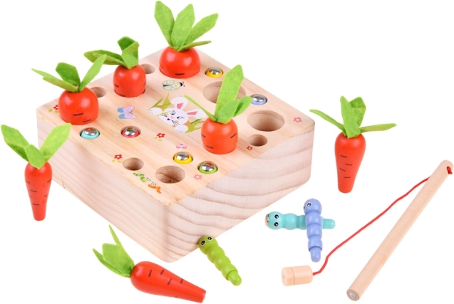 Dřevěná hra s mrkvičkami a červíky je navržena pro ty nejmenší, láká svou pestrou barevností a veselými motivy. Děti mohou hravě sklízet mrkve a červíky pomocí prutů s magnetem, což posiluje jejich koordinaci ruka-oko a jemnou motoriku.