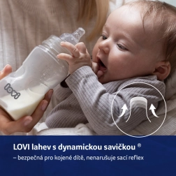 Lahev LOVI Trends vznikla ve spolupráci s odborníky a je klinicky testovaná. Speciální dynamická savička z tenké vrstvy silikonu se při krmení přirozeně prodlužuje a stahuje podle tempa dítěte, zatímco pevná, široká, profilovaná základna poskytuje stabilní oporu rtům a brání okusování. Antikolikový systém SUPER-vent omezuje pronikání vzduchu do mléka, a tím pomáhá předcházet kolikám.