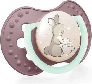 Ergonomický, do oblouku tvarovaný štítek s otvory pro cirkulaci vzduchu pomáhá předcházet podráždění citlivé pokožky. Svítící úchyt zajistí snadné podání i v noci a praktická krabička udrží šidítka hygienicky čistá na cestách.