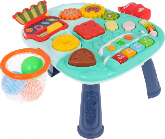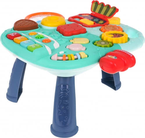 Obsahuje hudební tlačítka a další interaktivní prvky pro podporu smyslového rozvoje.