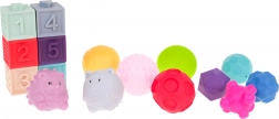 Součástí jsou číslované kostky pro první počítání a skládání, měkké míčky s bohatou strukturou a dvě zvířátka (ježek a medvídek) pro nápadité hry. Díky měkkému materiálu se hračky snadno drží i nejmenším dětem a pomáhají trénovat úchop a koordinaci oko–ruka.