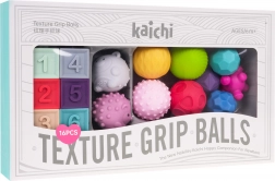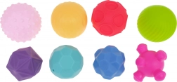 Každý míček a kostka má jedinečný povrch a vzor. Děti si trénují hmat, úchop i koordinaci, zatímco objevují barvy a tvary.