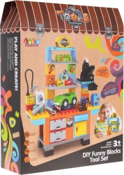 Postavte kompletní workshop s pracovním stolem, zvedákem a úložnými skříňkami. Barevné kostky podporují fantazii a samostatnou hru.