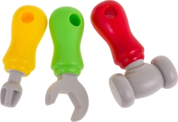 Součástí jsou šrouby, hřebíky i dětské nářadí: šroubovák, francouzský klíč a kladívko pro bezpečné šroubování a zatloukání.