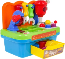 Tato interaktivní dílna kombinuje zábavu a učení v jednom. Díky světelným a zvukovým efektům u otáčecí pily a pohyblivého kladiva je hra poutavá a realistická. Svěrák na pracovním pultu pomůže dětem trénovat utahování a povolování, zatímco sortér tvarů rozvíjí logiku a koordinaci oko–ruka. Všechny vhozené dílky pohodlně najdete v výsuvné zásuvce.