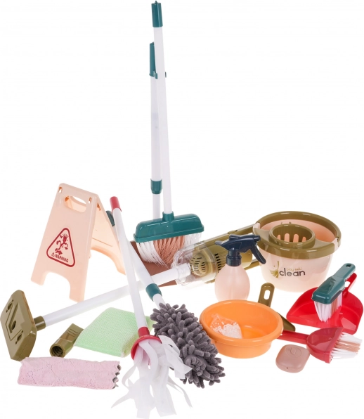 Dětský uklízecí set zahrnuje nástroje jako mop, kartáč, košťata a malý vysavač, které napodobují skutečné nářadí a přinášejí realističnost do hry.