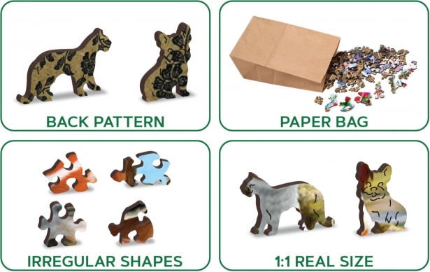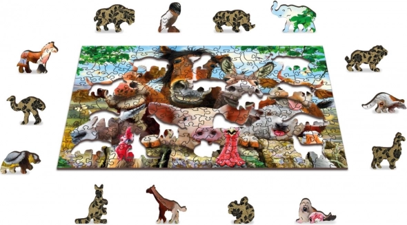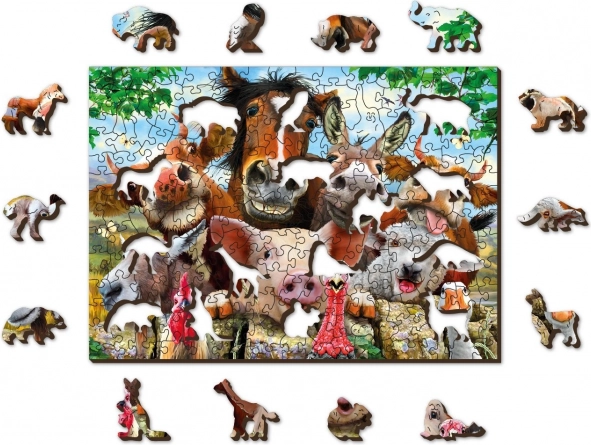 Dřevěné puzzle s motivem „Život na farmě“ přináší jedinečný zážitek z poskládání barevného obrazu plného veselých zvířátek. Díky preciznímu laserovému výřezu každého dílku do tloušťky 3–4 mm je skládání plynulé a zábavné, přičemž některé dílky mají podobu samostatných figurových tvarů. Oboustranný potisk umožní skládat podle obrázku i podle vzoru tvarů na rubu.