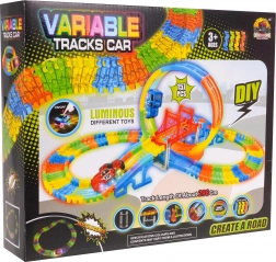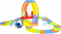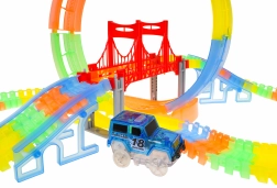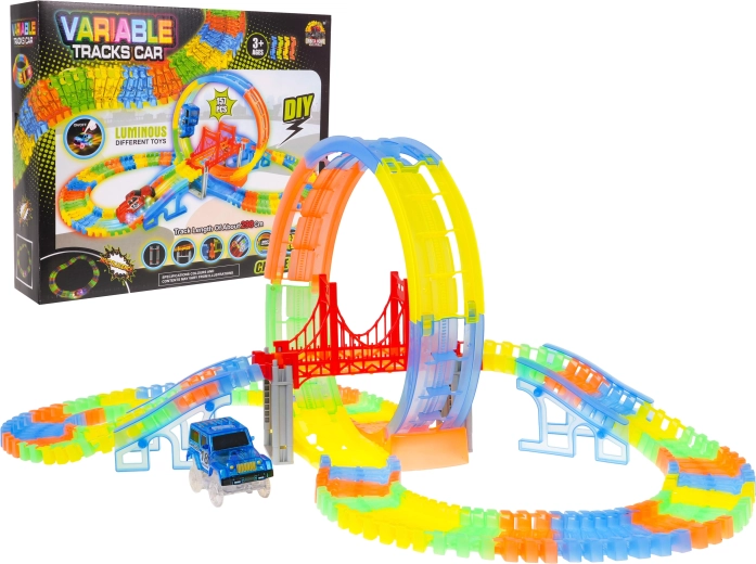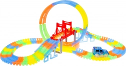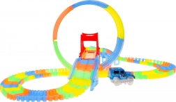 Tato barevná závodní dráha září ve tmě díky fluorescenčním dílům a přiloženému LED autíčku. Díly jednoduše zacvaknete do sebe, můžete je otáčet, zvedat a přeskupovat i během jízdy a vytvářet nové tratě s 360° smyčkou, mosty a rampami. Stačí stisknout tlačítko na střeše autíčka a závody mohou začít!
