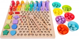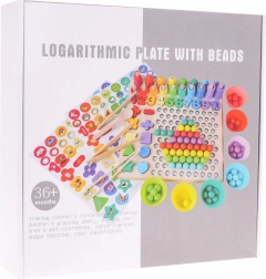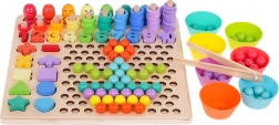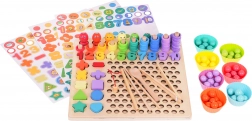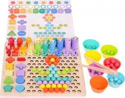 - dřevěná základna a nástavba s otvory, 3 oboustranné předlohy, 7 kelímků, pinzeta, udice, lžička, 2 tyčinky, 8 magnetických rybiček, 5 matematických znaků, číslice 1–10, 5 tvarů (čtverec, trojúhelník, kruh, hvězda, srdce), 55 kroužků, 77 korálků