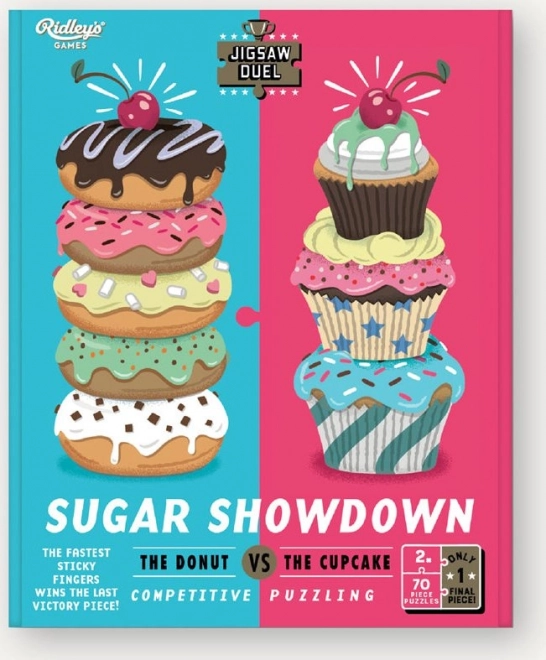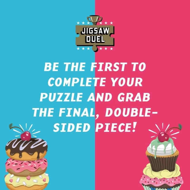 Užijte si napínavou skládačkovou výzvu pro dva s Puzzle Duel Sladké zúčtování: donut vs cupcake. Dvě mini puzzle po 70 dílcích, závod o poslední společný dílek a barevné předlohy v balení zaručí skvělou zábavu pro páry, přátele i rodiny.